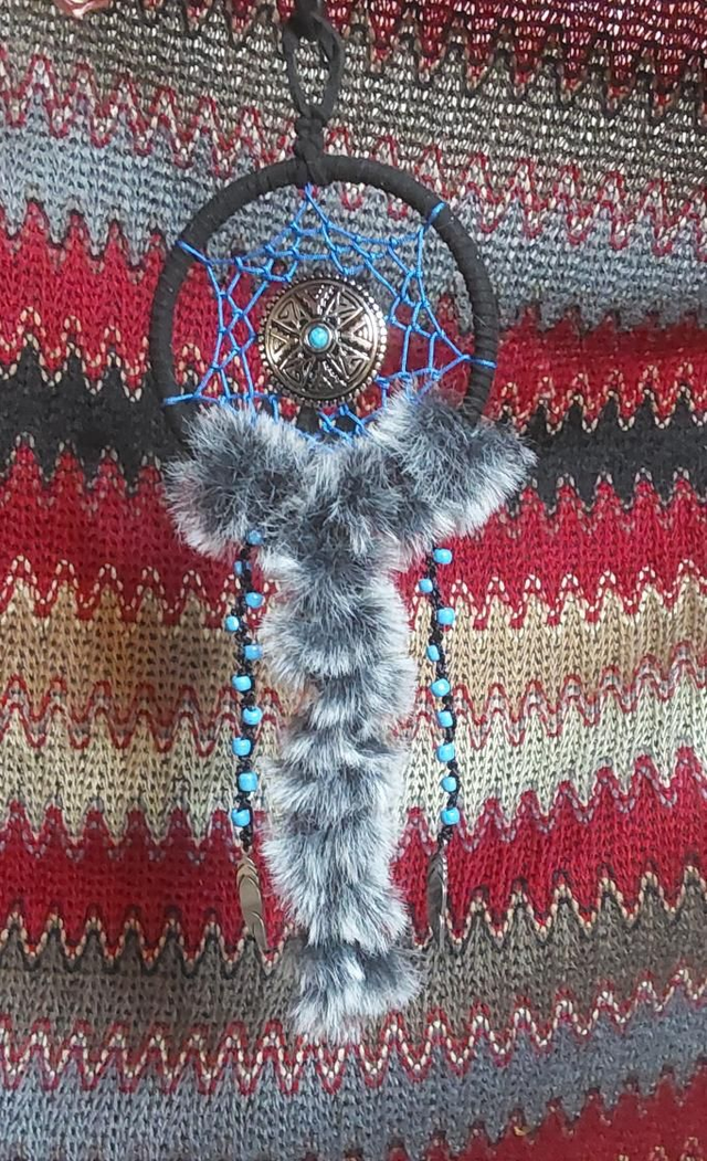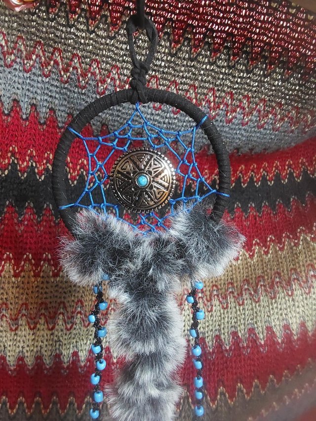 Tout mini avec son cercle de 7 cm de diamètre pour cet attrape rêves réalisé en fil nylon 0,8 cm et son joli concho de style amérindien.